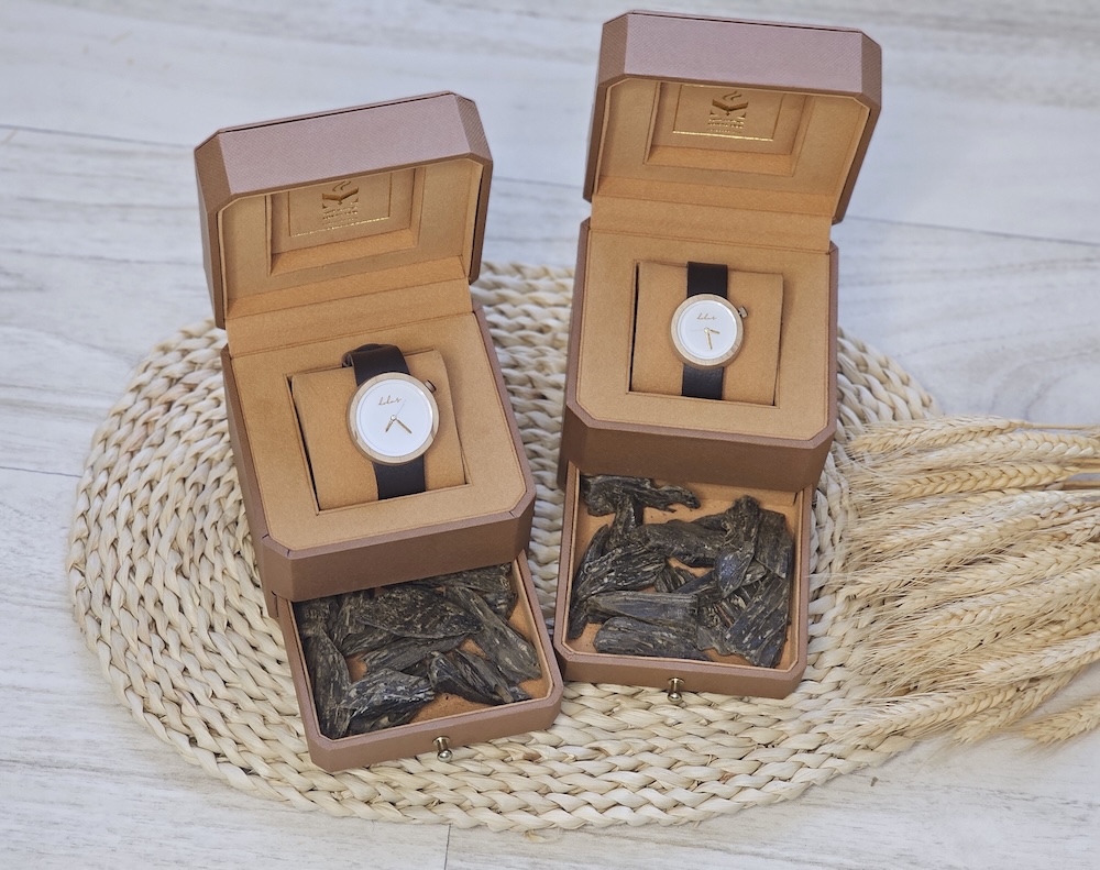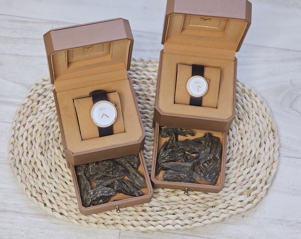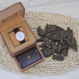 1. جودة المواد مضمونة: جلد بقري طبيعي، واستخدام نوعين من أقوى وأصلب الأخشاب في العالم (الروزوود والقيقب) لضمان المتانة وطول العمر. الآلية من نوع كوارتز أصلي ياباني من Miyota (شركة Citizen اليابانية)، مع بطارية تدوم حتى 3 سنوات. الزجاج محدب لمظهر فاخر.